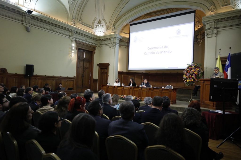 En el cambio de mando se traspasó la responsabilidad de conducir la unidad académica por los próximos cuatro años a Fernanda Pérez Trautmann, la primera mujer que ocupa el cargo de decana en la facultad. Créditos fotográficos de César Cortés.