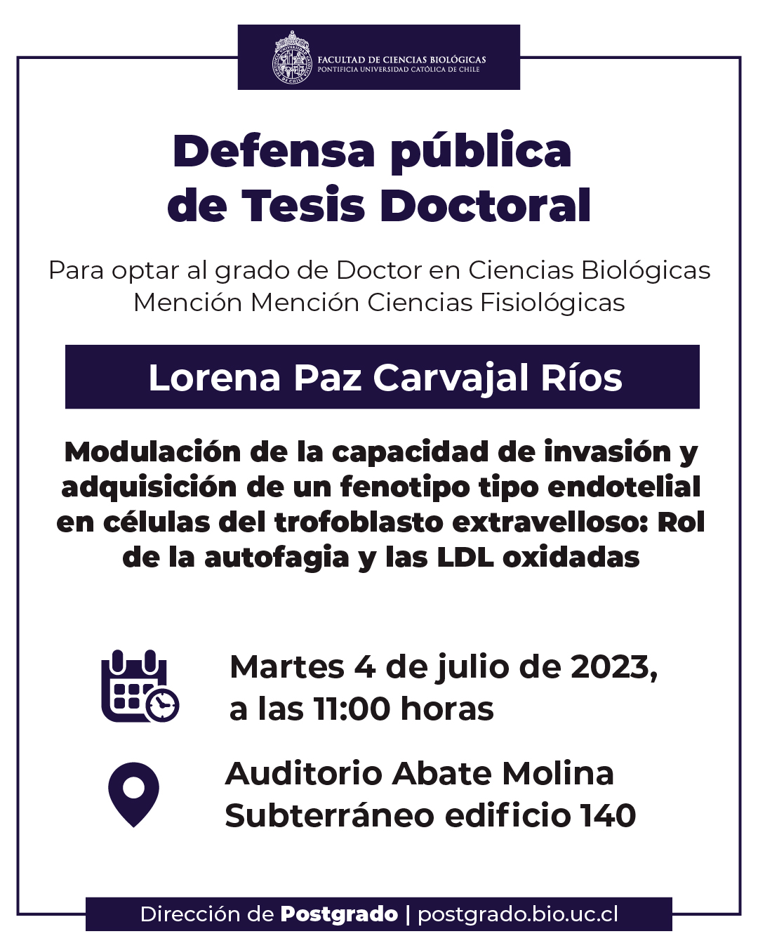 Defensa Pública de Tesis de Lorena Carvajal Ríos, mención Ciencias Fisiológicas: martes 4 de julio a las 11:00 hrs, Auditorio Abate Molina
