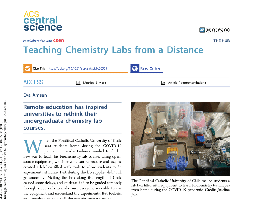 “Tuvieron que enviar pequeños laboratorios a las casas de las y los estudiantes en distintas comunas del Gran Santiago, en distintas ciudades del país. Eran cajas prototipadas con micropipetas, termocicladores y cámaras de electroforesis para llevar a cabo técnicas de biología molecular. Pesaban cerca de seis kilos. Las cajas iban a cada uno de los 46 estudiantes del curso del profesor Federici, quien ideó este plan de emergencia para experimentar de forma remota”, destacaba la Dirección de Comunicaciones de la UC, durante el año 2020.