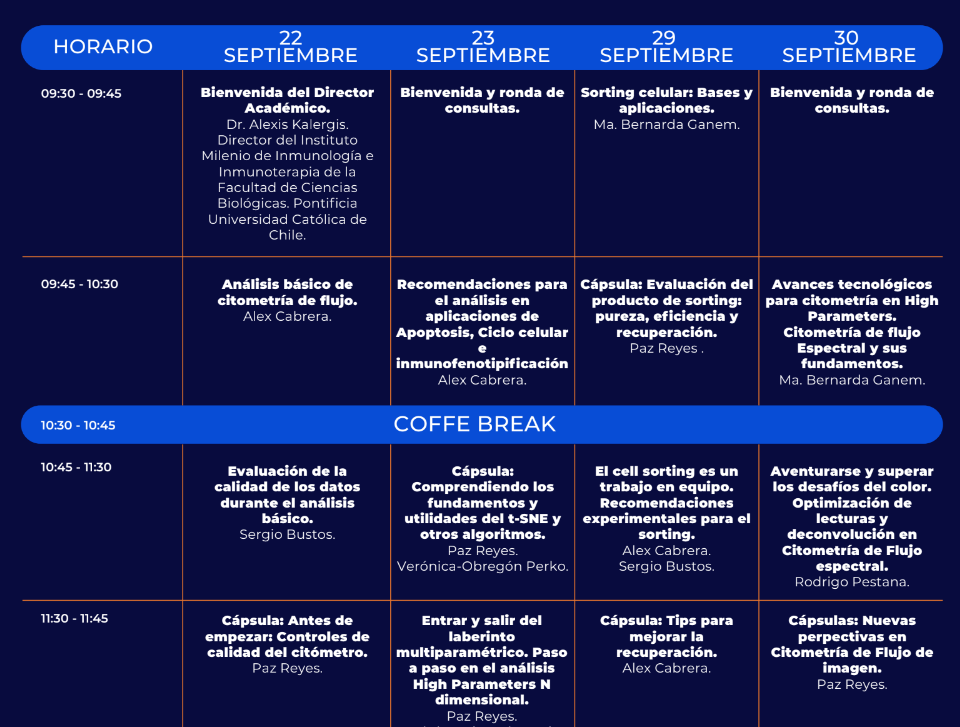 Por su parte, los profesionales de la Unidad, Alex Cabrera y Sergio Bustos, abordaran materias relativas al análisis básico en citometría, control de calidad de datos obtenidos y sugerencias para la evaluación de inmunofenotipos, ciclo celular y apoptosis; durante la segunda ronda de seminarios, el curso se enfocará en la separación celular, así como también técnicas más avanzadas en citometría multiparamétrica aplicable a varias líneas de investigación de la biología y medicina.