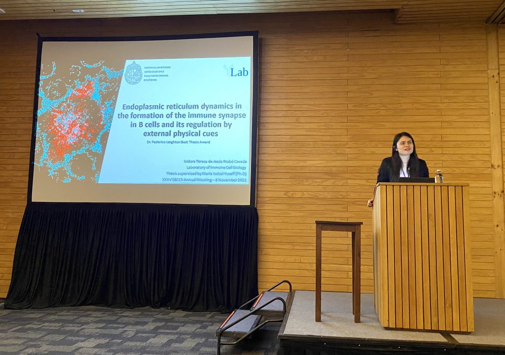El Premio Anual Dr. Federico Leighton a la Mejor Tesis de Pregrado, fue entregado a la Bioquímica Isidora Riobó, a raíz del trabajo dirigido por la académica María Isabel Yuseff, y realizado en el Laboratorio de Comunicación y Función de Células del Sistema Inmune.