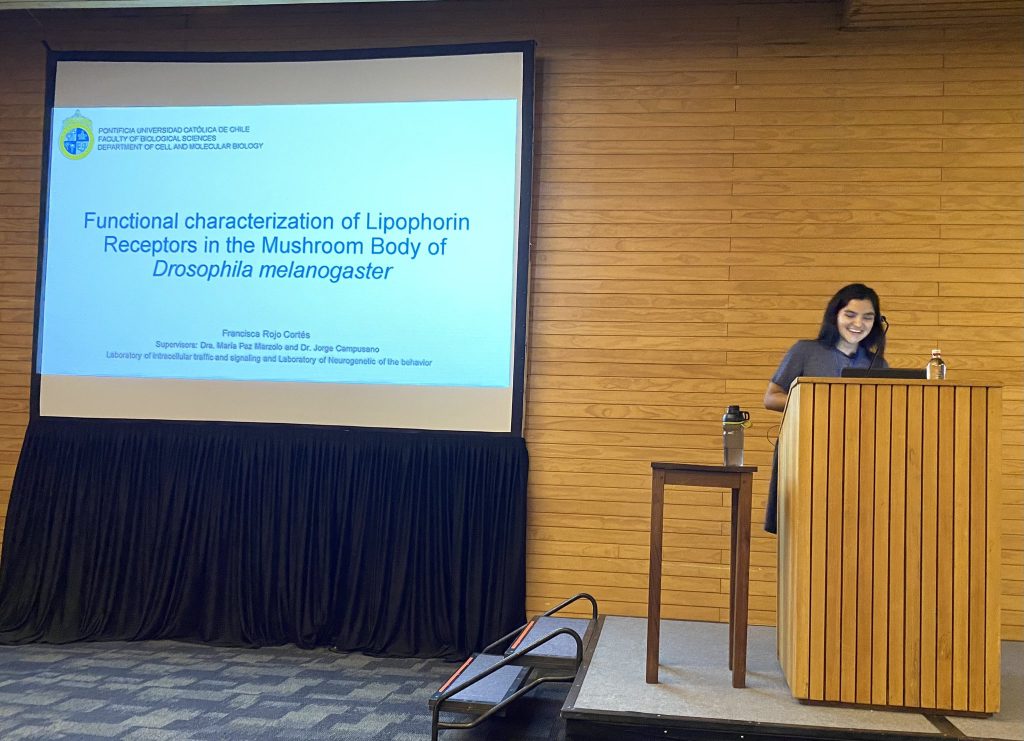 “Este trabajo no podría haberse llevado a cabo sin el apoyo de mis tutores: la Dra. María Paz Marzolo y el Dr. Jorge Campusano. También agradezco al Dr. Carlos Oliva, parte de mi comité de tesis, por tomarse el tiempo de darme concejos y discutir resultados múltiple ocasiones. También a los Dres. John Ewer y Waldo Cerpa; al Dr. Serge Birman, quien creyó en mi trabajo y me recibió en su laboratorio para hacer la pasantía. También agradezco a todos los miembros de los laboratorios en los que estuve a través de estos años, y a mis compañeros de generación, mi paso por el doctorado no habría sido lo mismo sin su apoyo, compañía y enseñanzas, especialmente durante toda la pandemia. Menciono especialmente a Candy Roa, quien hizo su tesis de pregrado anexada a la mía, y en la que participé en calidad de tutora. A los Dres. Constanza González, Nicolás Fuenzalida y Sergio Hidalgo por las colaboraciones. Y, por último, pero no menos importante, al personal de apoyo de los laboratorios, especialmente a las señoras Bárbara y Soledad, quienes preparan la comida para las mocas. ¡Y a Juanito y Héctor! Por todas las autoclavadas de última hora y mantención de equipos”, finalizó esta entrevista la Dra. Rojo.