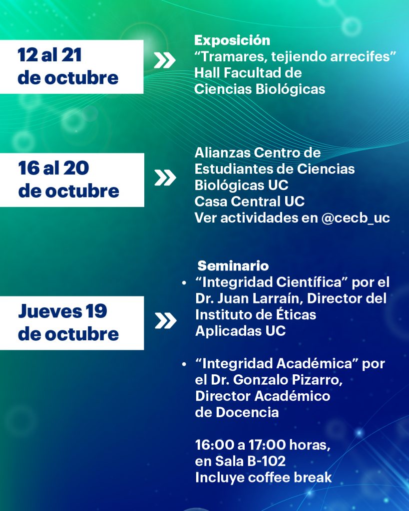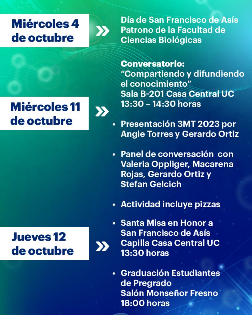 Dentro de las actividades se encuentra “Compartiendo y difundiendo el conocimiento”: un conversatorio con las divulgadoras científicas Valeria Oppliger y Macarena Rojas como también la participación del académico de la Facultad de Ciencias Biológica y director del Instituto Milenio en Socio-ecología Costera (SECOS), Stefan Gelcich y el estudiante del doctorado Gerardo Ortiz (3MT 2023). (REAGENDADO fecha nueva por confirmar)