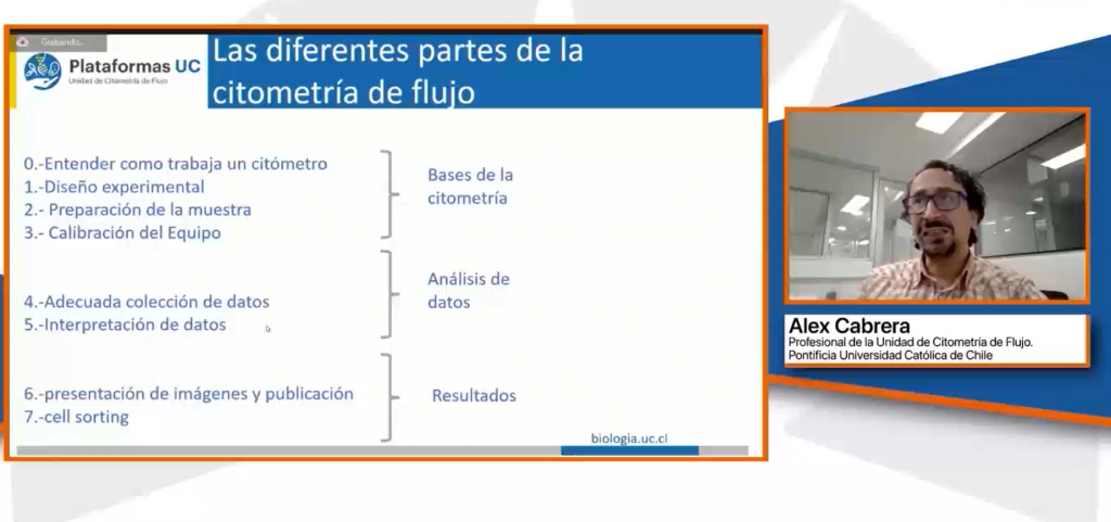 En palabras de inicio, las instituciones organizadoras dieron una breve introducción sobre el rol que tiene esta serie de seminarios para apoyar a los profesionales, coordinadores técnicos y estudiantes. El Doctor Alexis Kalergis, Coordinador Académico de la Unidad de Citometría de Flujo, destacó “el rol de esta tecnología tanto en el desarrollo de la inmunología y el aporte de esta herramienta en el rápido avance de estudios clínicos para la vacunación contra el COVID-19”. Cabe destacar que el Dr. Kalergis, es académico de la Facultad de Ciencias Biológicas, director del Instituto Milenio de Inmunología e Inmunoterapia (IMII) y director del estudio Sinovac en Chile.