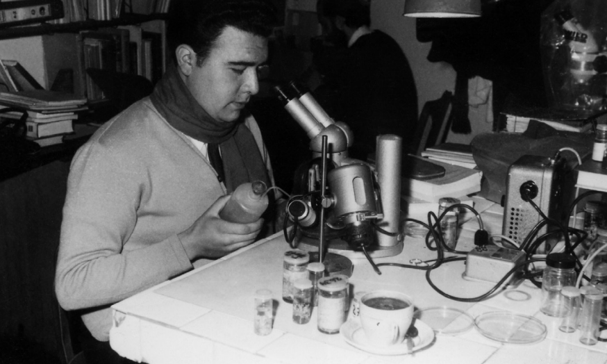Créditos fotografía: Dr. Bernabé Santelices observando especímenes bajo una lupa binocular en la década de los setenta; Ecólogos y Ecología en la Facultad de Ciencias Biológicas de la Pontificia Universidad Católica de Chile. Ediciones UC Santiago