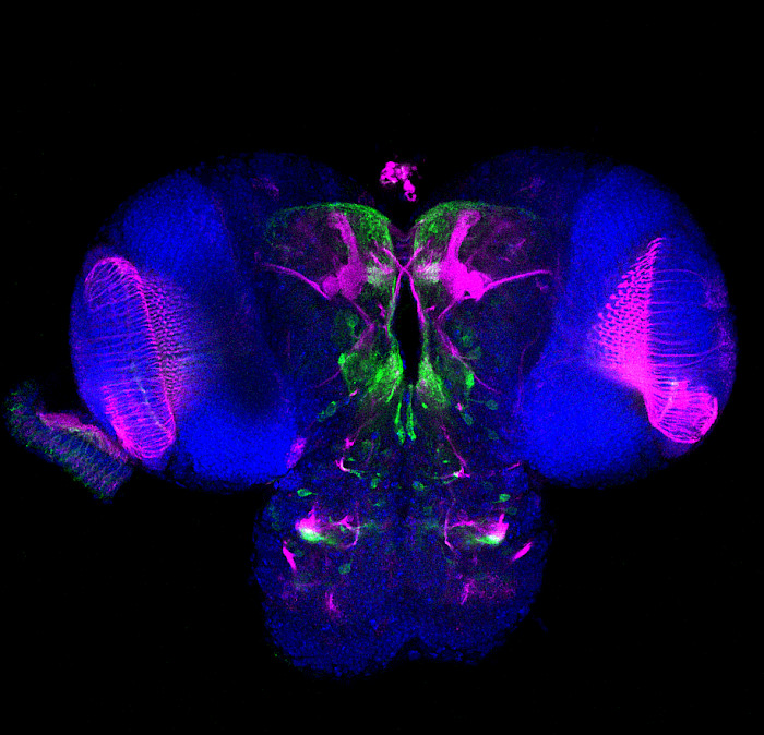 “La fotografía corresponde a una imagen representativa del cerebro de larva de la mosca Drosophila melanogaster. En verde se marcan las zonas del cerebro donde se expresa LpR1. En magenta se aprecia Fasciclina II, una proteína altamente expresada en el cuerpo fungiforme de la mosca, lo que permite visualizarlo. El cuerpo fungiforme es una estructura cerebral presente en varios insectos que tiene como principal función conocida el procesamiento y almacenamiento de la memoria olfativa. La marca azul corresponde a una tinción con Dapi: este es un compuesto químico fluorescente que se une al DNA, lo que permite marcar los núcleos celulares”, detalla.
