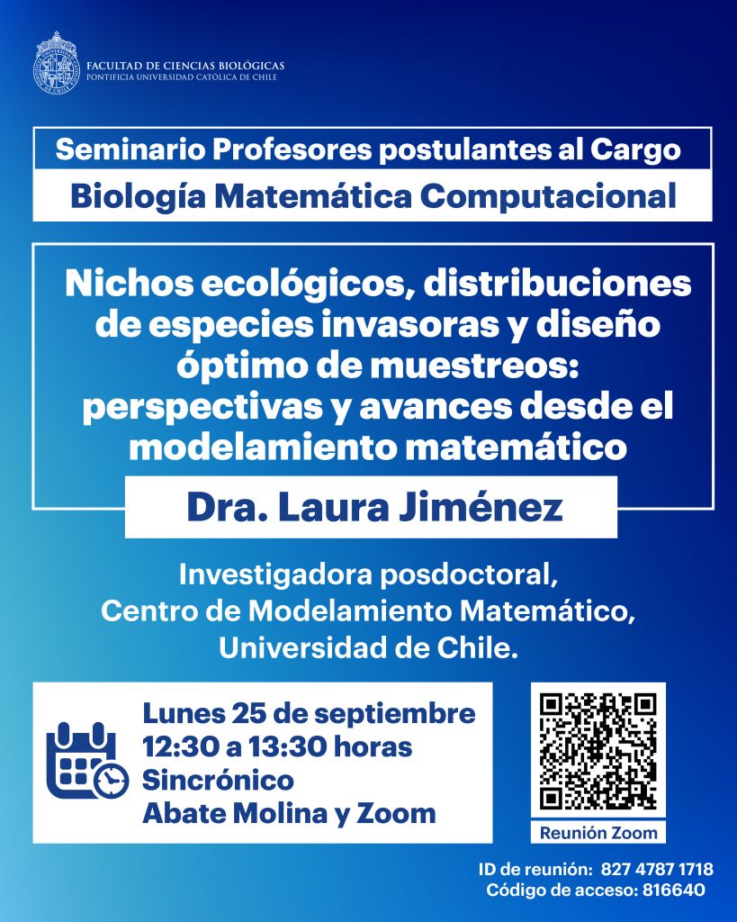 Título seminario: Nichos ecológicos, distribuciones de especies invasoras y diseño óptimo de muestreos: perspectivas y avances desde el modelamiento matemático por Dra. Laura Jiménez.