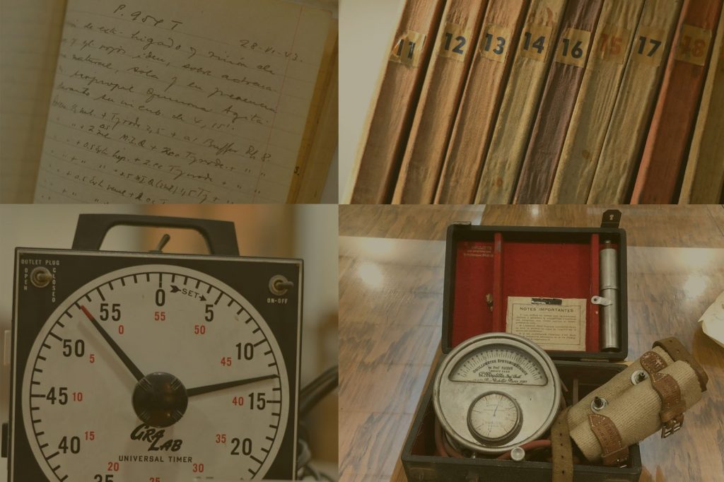 Créditos fotografías: Muchos de estos objetos fueron donados por el profesor Héctor Croxatto Rezzio (1908-2010), uno de los primeros científicos chilenos cuyo trabajo en biología experimental fue reconocido en los circuitos de excelencia científica internacional. Además, tuvo gran compromiso con la educación científica de profesores escolares e intentó generar conciencia sobre la importancia del desarrollo científico para el país.