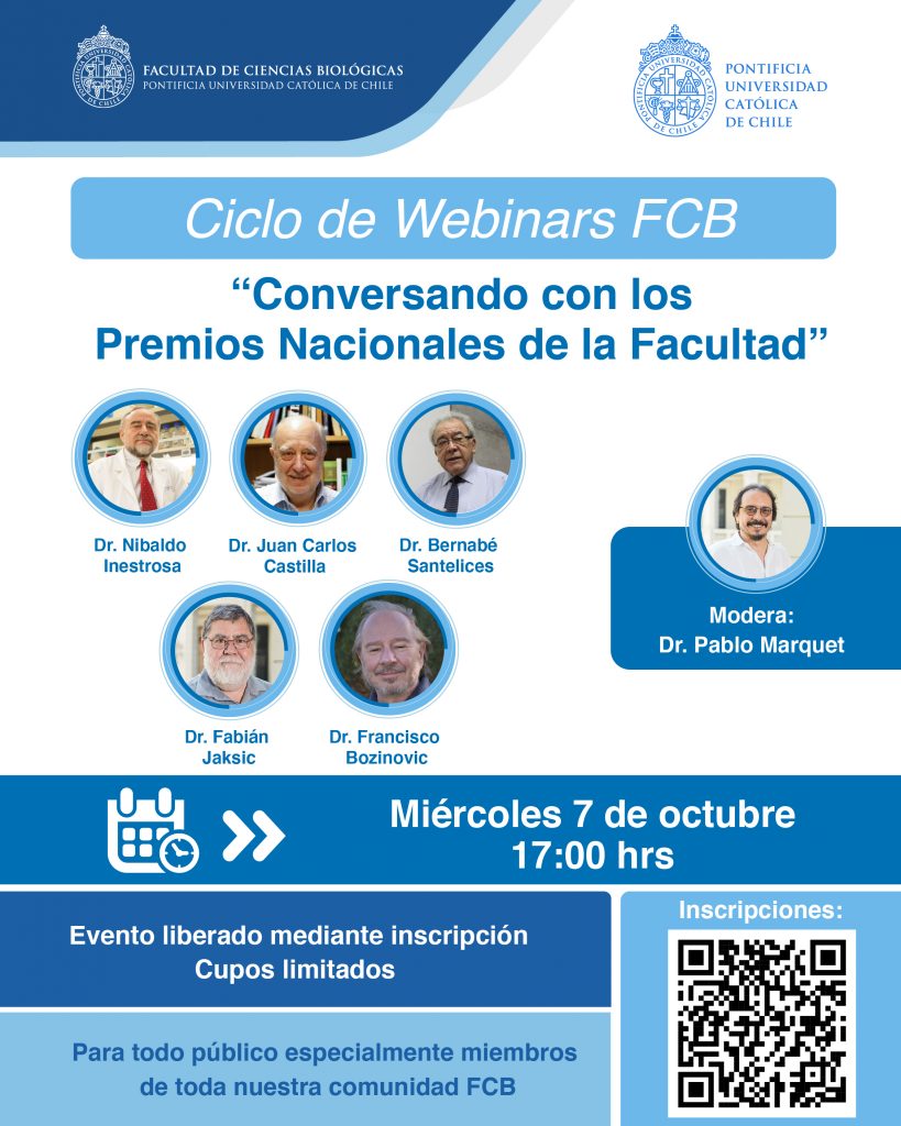 Conversando con los Premios Nacionales de la Facultad: La Facultad siempre ha destacado a sus exalumnos y académicos que han recibido premios nacionales. Es por esto, que a raíz de su importante labor en las ciencias nacionales, se realizará el próximo miércoles 7 de octubre a las 17:00 horas, un conversatorio con los Doctores y premios nacionales Nibaldo Inestrosa, Juan Carlos Castilla, Bernabé Santelices, Fabian Jacksic y Francisco Bozinovic.
