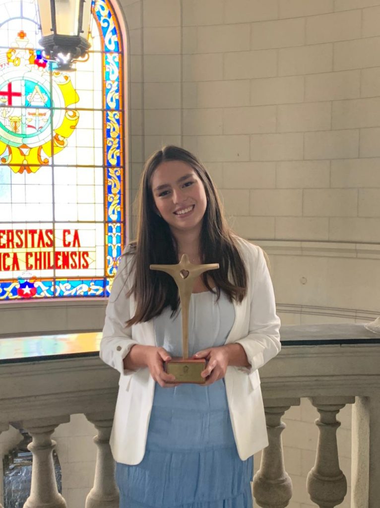 María de los Ángeles Ossorio Sottorff, estudiante de Pregrado de la Facultad de Ciencias Biológicas, recibió el premio Espíritu UC, el cual destaca anualmente a estudiantes de pregrado que, a lo largo de su etapa universitaria, han promovido los valores y el espíritu de la Pontificia Universidad Católica; demostrando un fuerte compromiso con el desarrollo y bienestar del país, con un espíritu de servicio en beneficio del bien común.