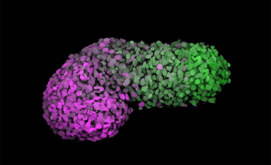 Créditos fotografía: Gastruloide humano en crecimiento después de la agregación de células madre embrionarias. El azul marca el ADN, el magenta las células neurales (SOX2) y el verde las células mesodérmicas (BRA).