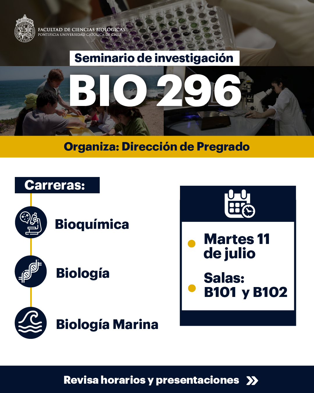 Participa del Seminario de Investigación BIO296 este martes 11 de julio: salas B101 y B102 desde las 09:00 a 17:30 horas