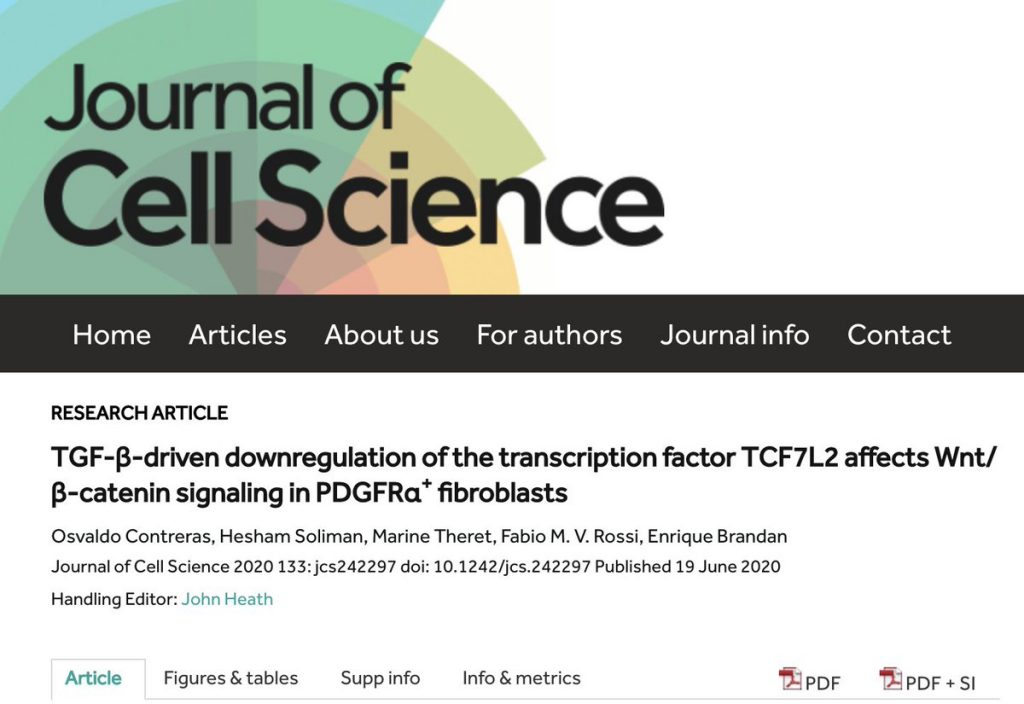 El investigador principal del artículo, el Dr. Osvaldo Contreras, en los últimos años trabajó en el Laboratorio del Dr. Brandan desarrollando su tesis doctoral entre los años 2014-2019. El artículo publicado se titula en inglés: “TGF-β-driven downregulation of the transcription factor TCF7L2 affects Wnt/β-catenin signaling in PDGFRα+ fibroblasts”. En esta larga travesía de investigación, Osvaldo exploró y estudió el comportamiento de los fibroblastos residentes en el tejido muscular y cardiaco en condiciones de homeostasis, regeneración y reparación como ocurre en patologías y enfermedades crónicas.
