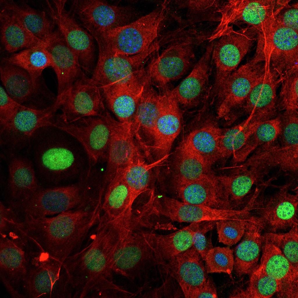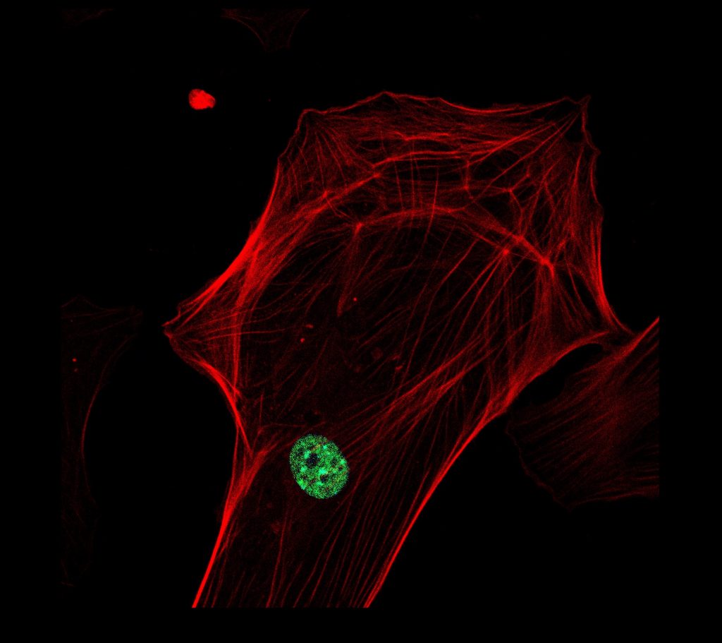 Microscopía confocal que muestra el factor de transcripción nuclear llamado TCF7L2/TCF4 (en verde) en fibroblastos por Osvaldo Contreras