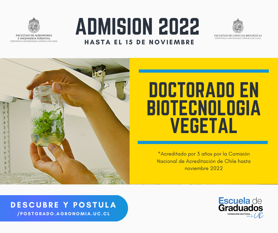 Desde sus inicios en el año 2010, el Doctorado en Biotecnología Vegetal se ha convertido en el primer programa dictado en conjunto por las facultades de Agronomía e Ingeniería Forestal y Ciencias Biológicas, donde las y los estudiantes con conocimiento avanzado en aplicaciones agronómicas y biotecnológicas, pueden realizar sus pasantías en la Universidad de Bordeaux con opción al doble grado.