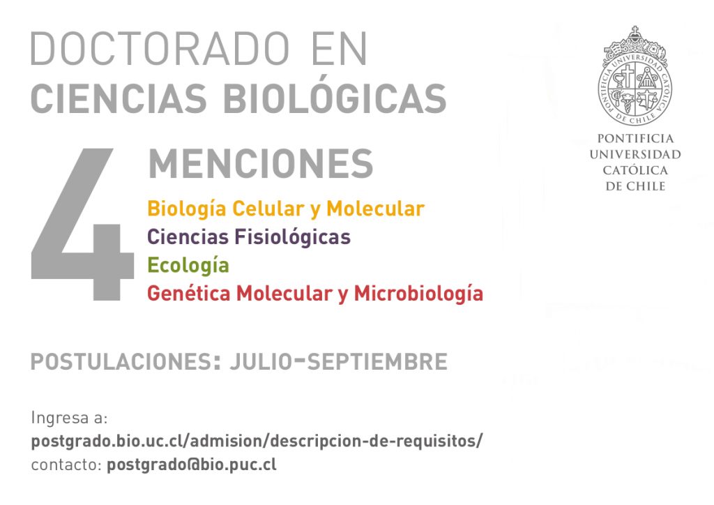 La Dirección de Postgrado de la Facultad de Ciencias Biológicas informa que se encuentran abiertas las postulaciones para cursar estudios de postgrado en las menciones de: Biología Celular y Molecular, Ciencias Fisiológicas, Ecología y Genética Molecular y Microbiología.