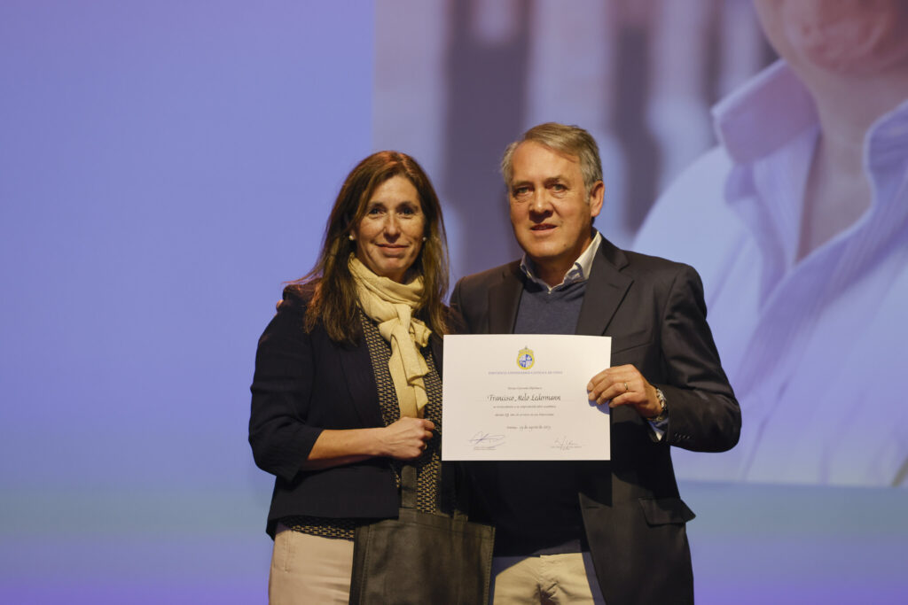 Dr. Francisco Melo junto a María Angélica Fellenberg, Vicerrectora de Investigación y Postgrado UC, en la ceremonia del Día de la Trayectoria Académica.