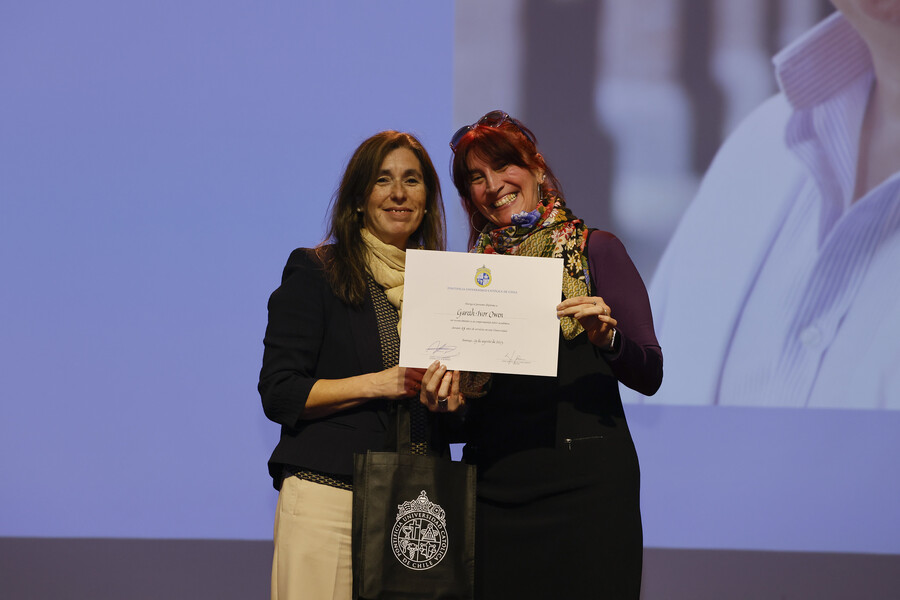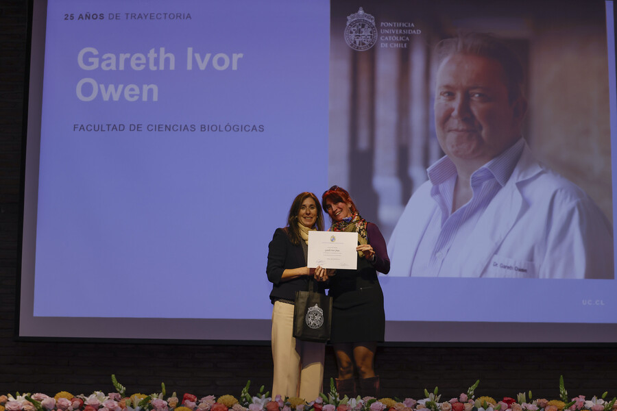 Dra. Cristina Bertocchi, en representación del Dr. Gareth Owen, junto a María Angélica Fellenberg, Vicerrectora de Investigación y Postgrado UC, en la ceremonia del Día de la Trayectoria Académica.