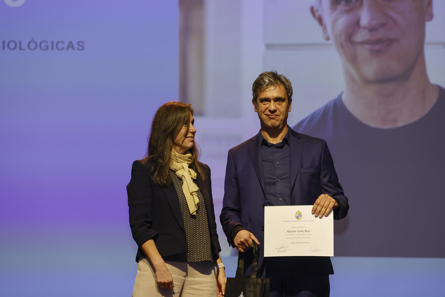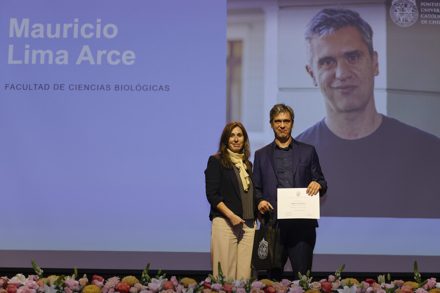 Dr. Mauricio Lima junto a María Angélica Fellenberg, Vicerrectora de Investigación y Postgrado UC, en la ceremonia del Día de la Trayectoria Académica.