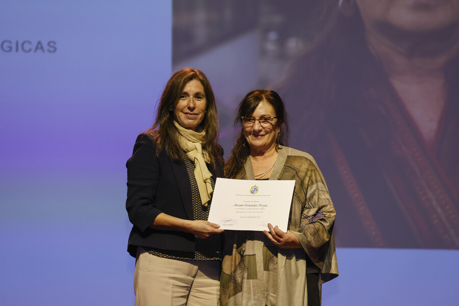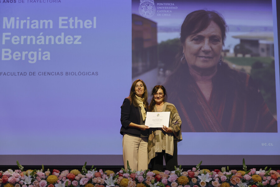 Dra. Miriam Fernández junto a María Angélica Fellenberg, Vicerrectora de Investigación y Postgrado UC, en la ceremonia del Día de la Trayectoria Académica.