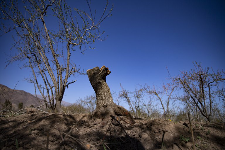 Una plantación de duraznos arrasada por la sequía, que también afectó a los productores de frutas y granos del sur y a los apicultores en el centro del país.