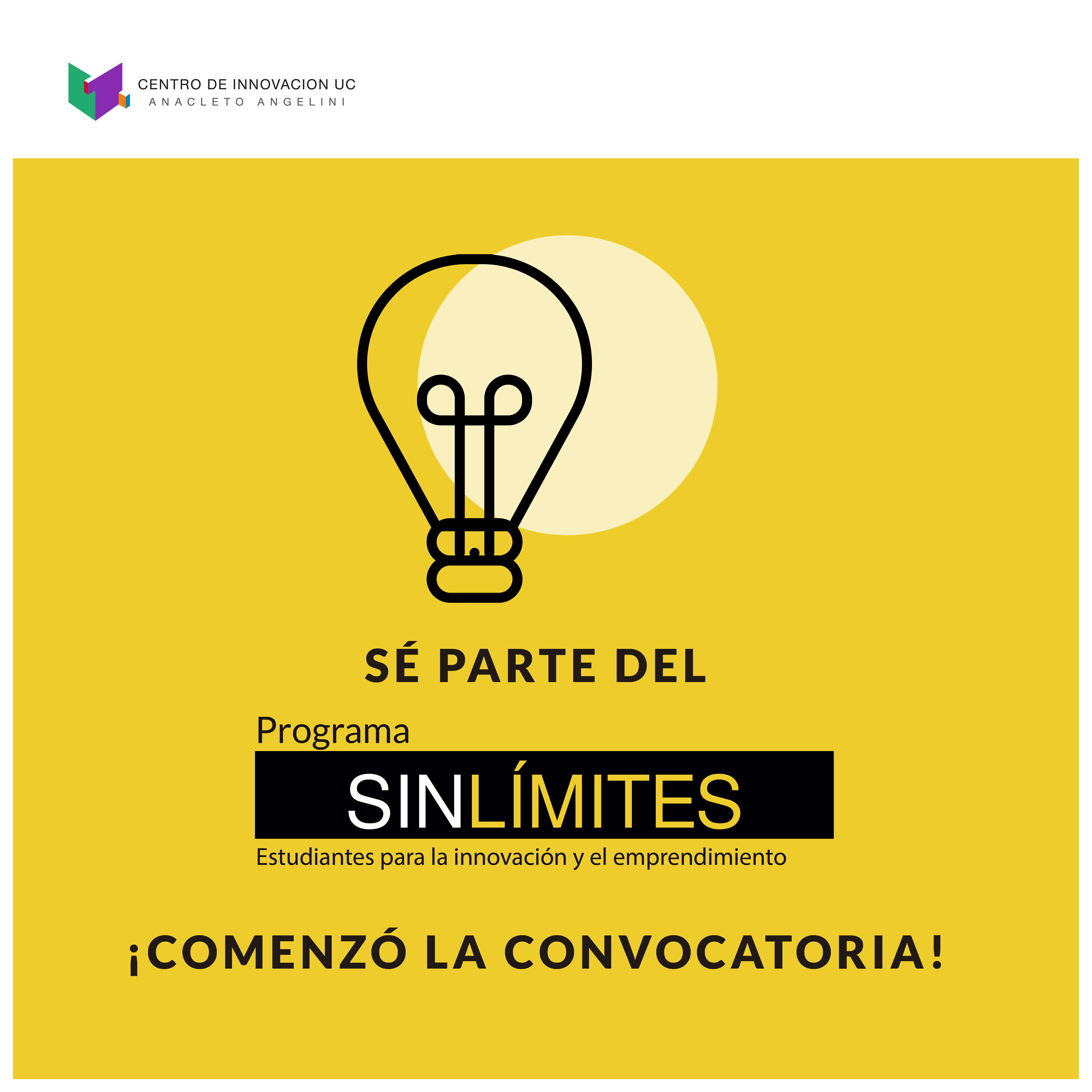 Con el fin de impulsar la cultura pro innovación y emprendimiento, el Centro de Innovación UC tiene vigente una nueva convocatoria del programa SINLÍMITES que invita a los alumnos de la universidad a resolver desafíos reales planteados por diversas empresas e instituciones en equipos multidisciplinarios.