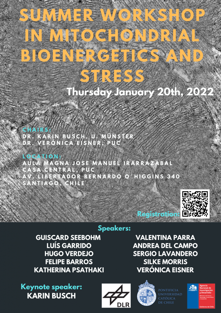 El próximo jueves 20 de enero de 2022, se realizará el Summer Workshop in Mitochondrial Bioenergetics and Stress, organizado por la Dra. Verónica Eisner, profesora de la Facultad de Ciencias Biológicas de la Pontificia Universidad Católica de Chile, y la Dra. Karin Busch, de la Universidad de Münster, Alemania.