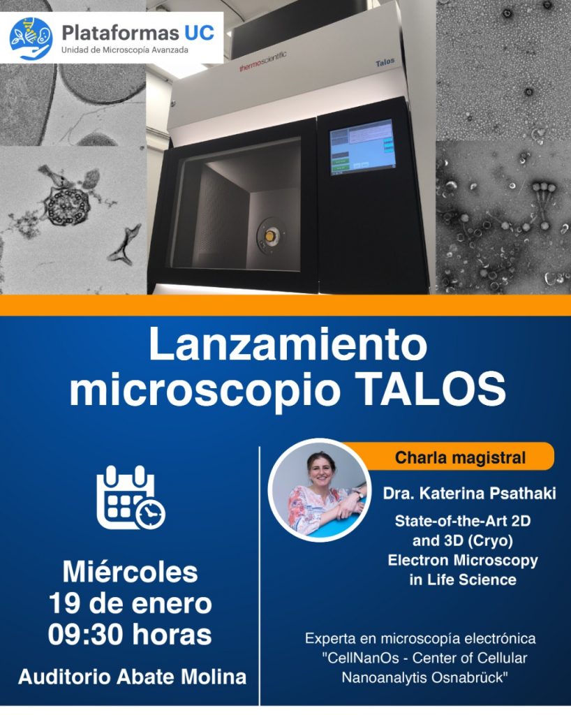 El próximo miércoles 19 de enero a las 09:30 horas, en el auditorio Abate Molina se realizará una charla magistral de la Dra. Katerina Psathaki, “State of the Art 2D and 3D (Cyro) Electron Microscopy in Life Science”. La experta en microscopía electrónica será parte del lanzamiento del Microscopio TALOS, en el auditorio Abate Molina.
