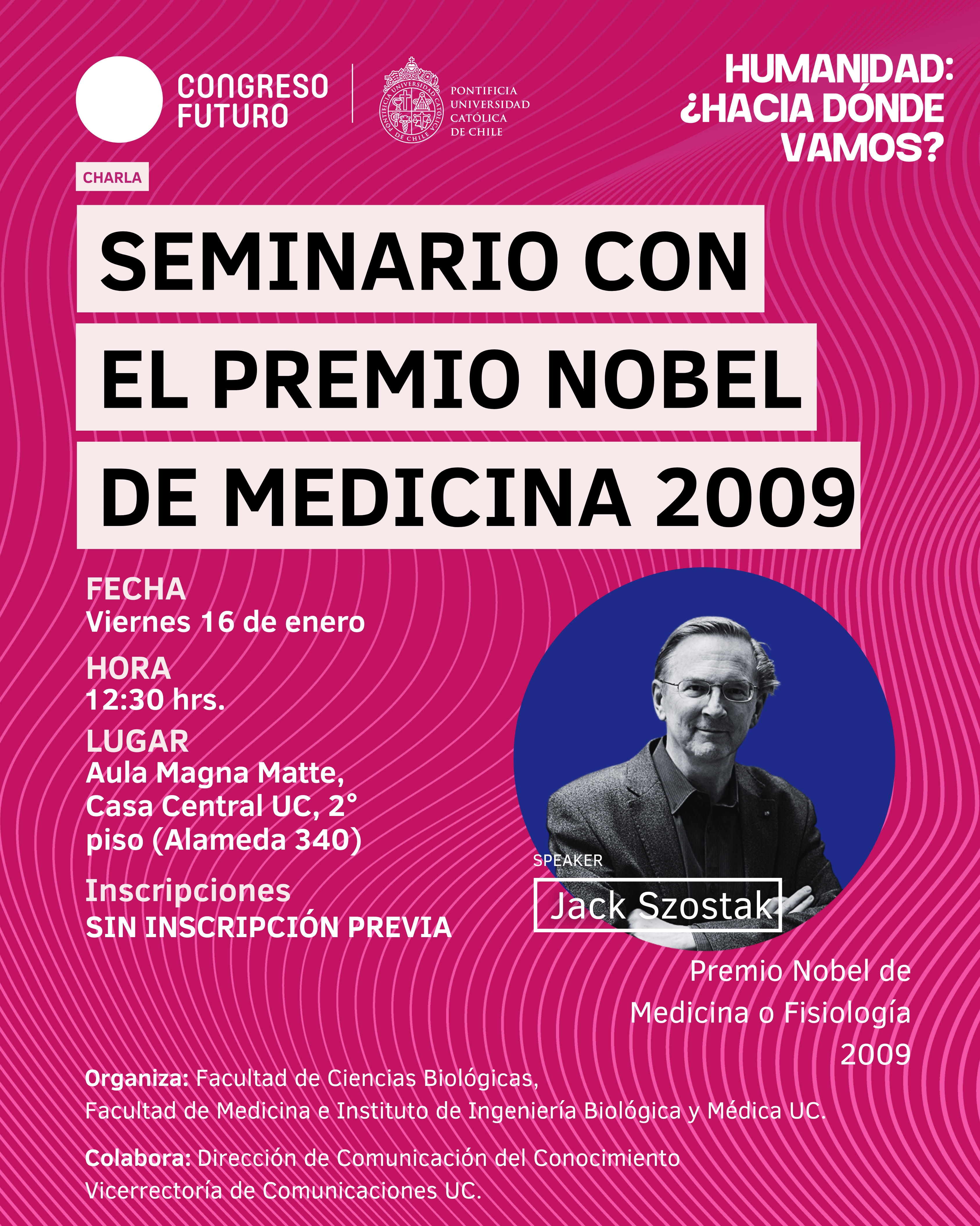 ¡Participa del seminario del Premio Nobel de Medicina 2009, Jack Szostak! | Viernes 16 de enero a las 12:30 hrs en el aula magna Matte (campus Casa Central)