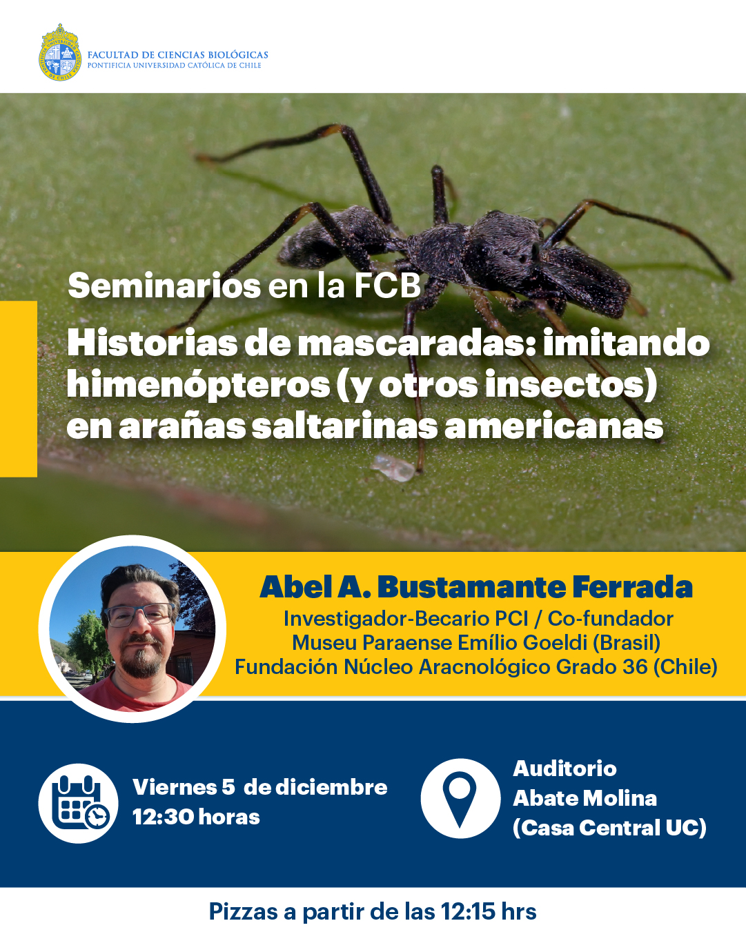 Participa del seminario “Historias de mascaradas: imitando himenópteros (y otros insectos) en arañas saltarinas americanas” este viernes 5 de diciembre a las 12:30 hrs en el auditorio Abate Molina