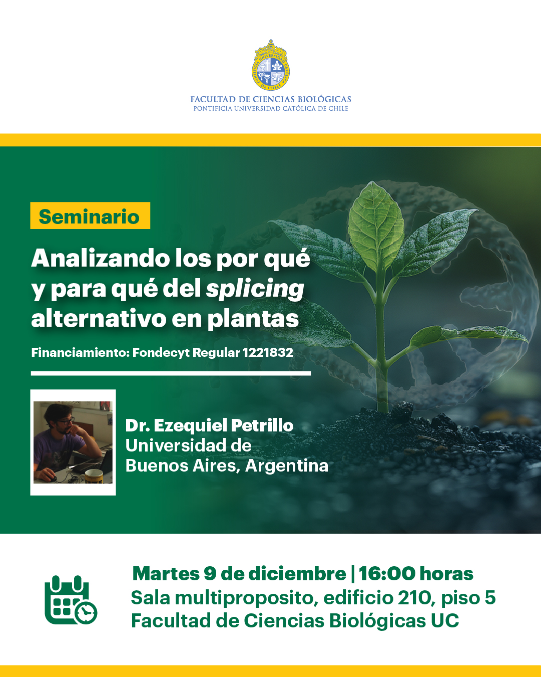 Te invitamos al seminario “Analizando los por qué y para qué del splicing alternativo en plantas” | 9 de diciembre a las 16:00 hrs en la sala multipropósito (edificio 210)