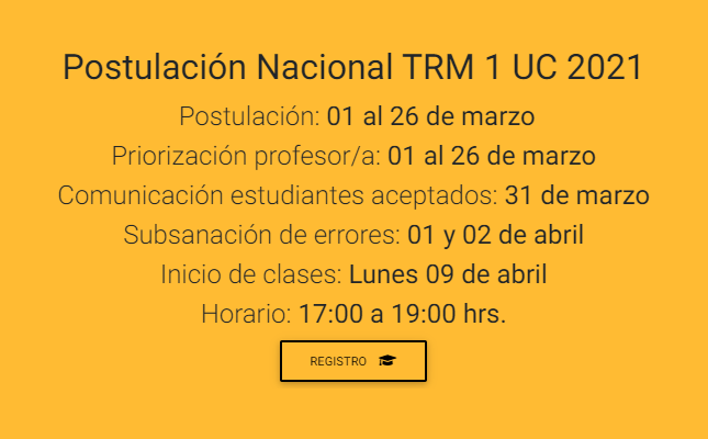 Desde el año 2011, el Taller de Razonamiento Matemático (TRM) de la Facultad de Matemáticas UC, se ha posicionado a nivel nacional como una de las actividades de divulgación científica más grande del país. Esta iniciativa, gratuita y abierta a todos los colegios, nace para otorgar un espacio para que las y los estudiantes secundarios con inquietudes especiales en matemática, puedan potenciar sus habilidades y profundizar sus conocimientos a través de desafíos matemáticos.