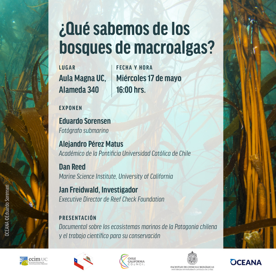 El académico UC Alejandro Pérez Matus, ha organizado un seminario con varios presentadores en torno a lo que sabemos de los bosques de macroalgas. En la instancia, se presentará un documental sobre ecosistemas marinos de la Patagonia chilena y el trabajo científico para su conservación.