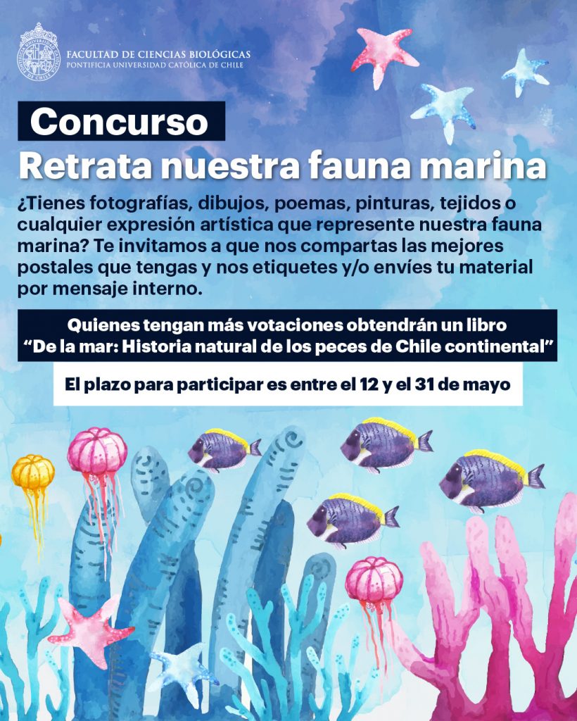 Si cuentas con fotografías, poemas, dibujos, pinturas, tejidos o cualquier expresión artística propia, este concurso es para ti. Queremos que nos compartas las mejores postales de la fauna marina. Nos puedes enviar el material por mensajes (DM) o bien etiquetarnos en el Instagram de Ciencias Biológicas. Seleccionaremos a quienes nos envíen su material.